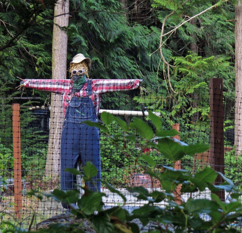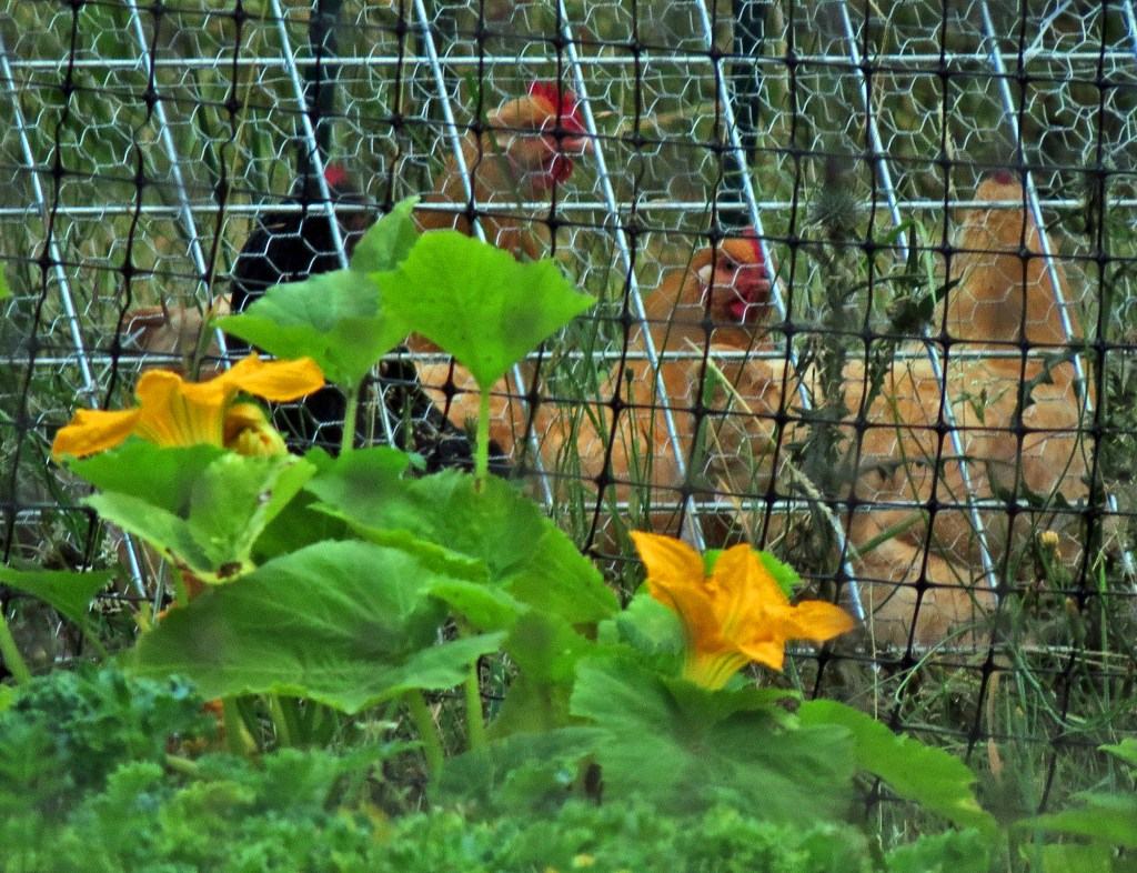 This place had a vegetable garden, complete with a well-dressed scarecrow; and they had a few chickens. Their zucchini seems to be doing very well.