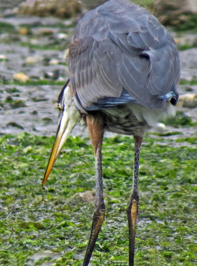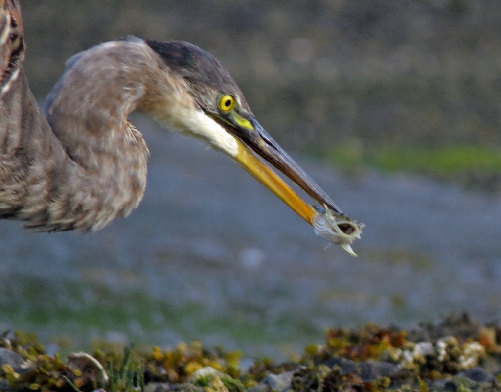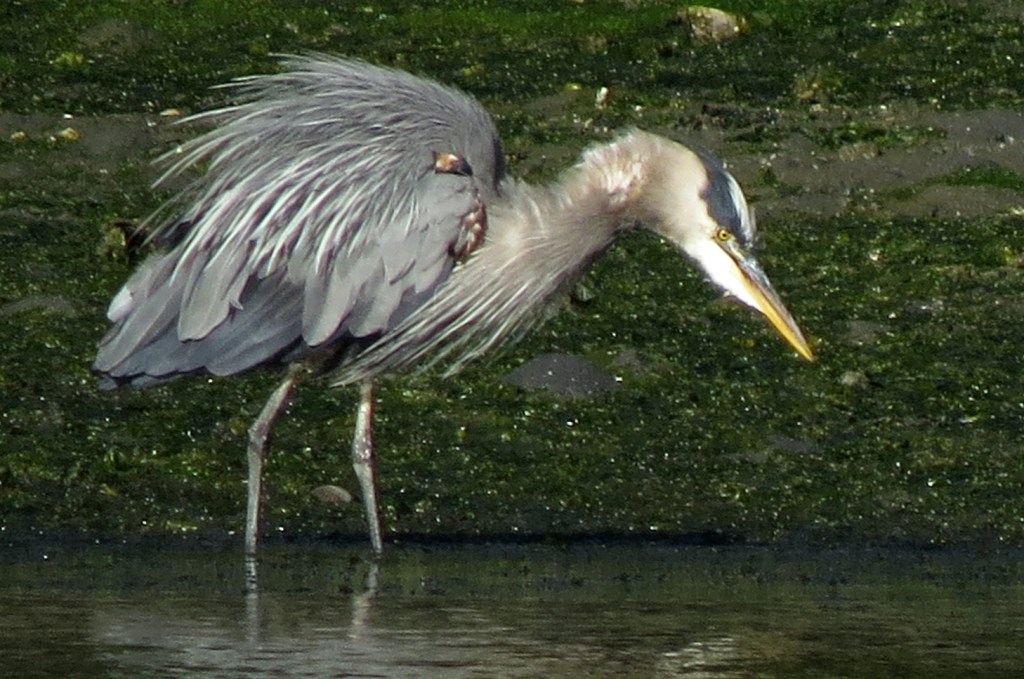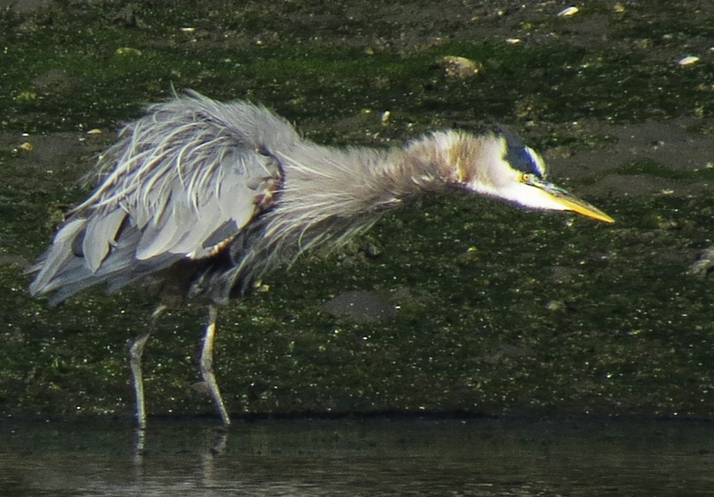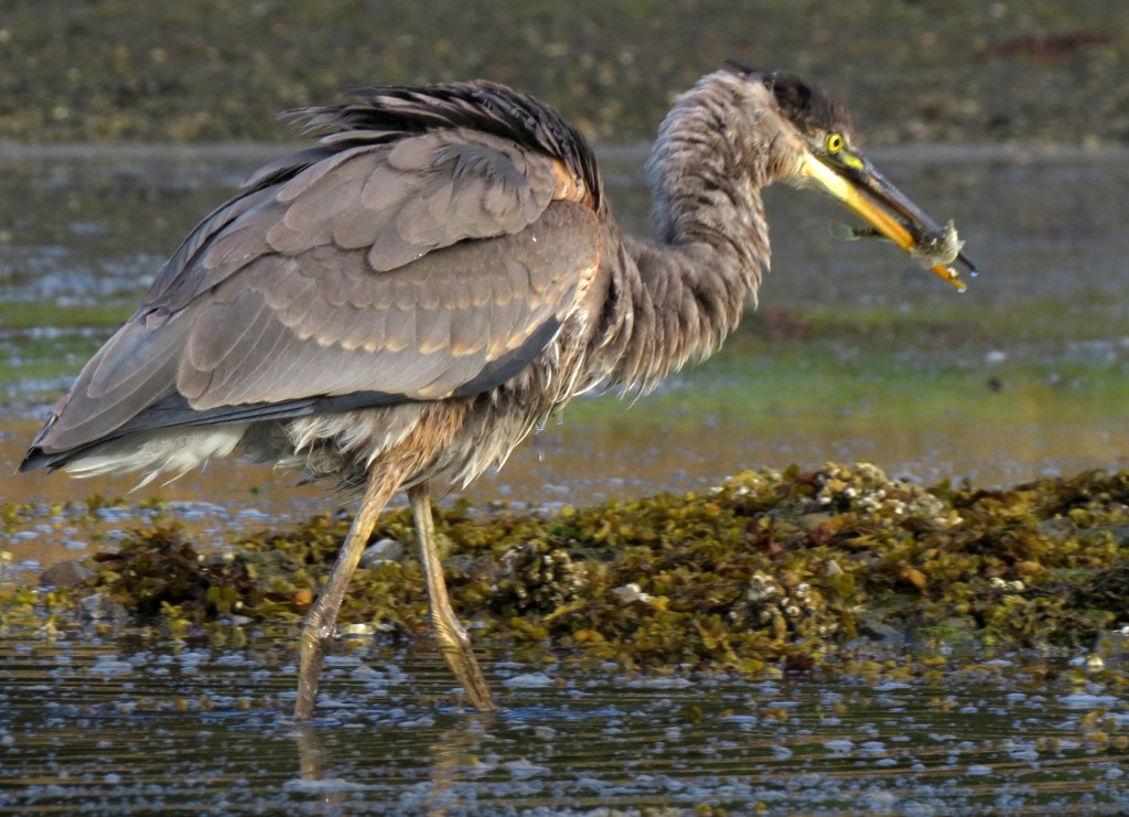 The blue heron was back this morning, fishing at the head of the bay, and the catching was good.