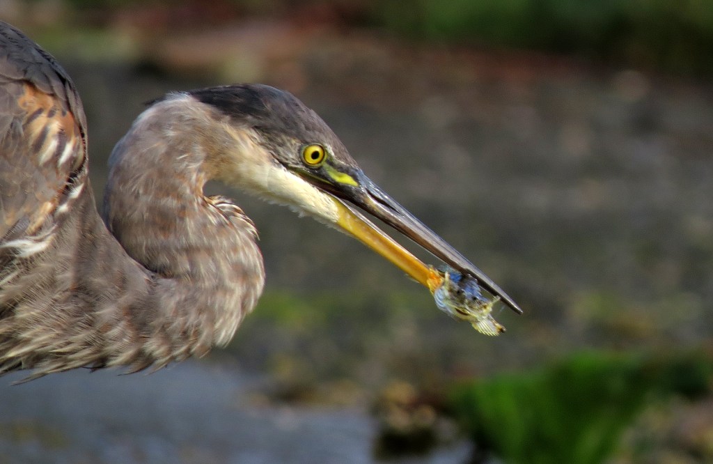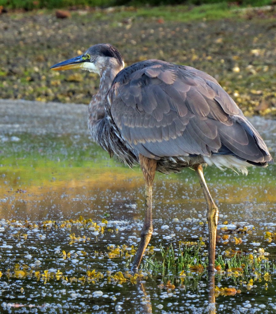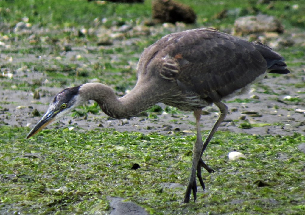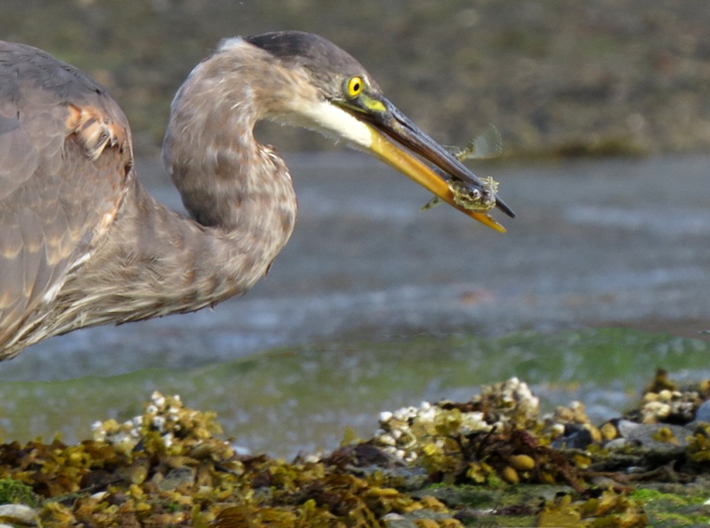 The blue heron was back this morning, fishing at the head of the bay, and the catching was good.