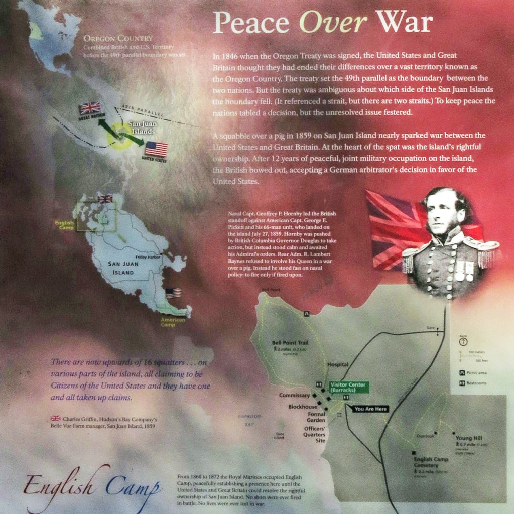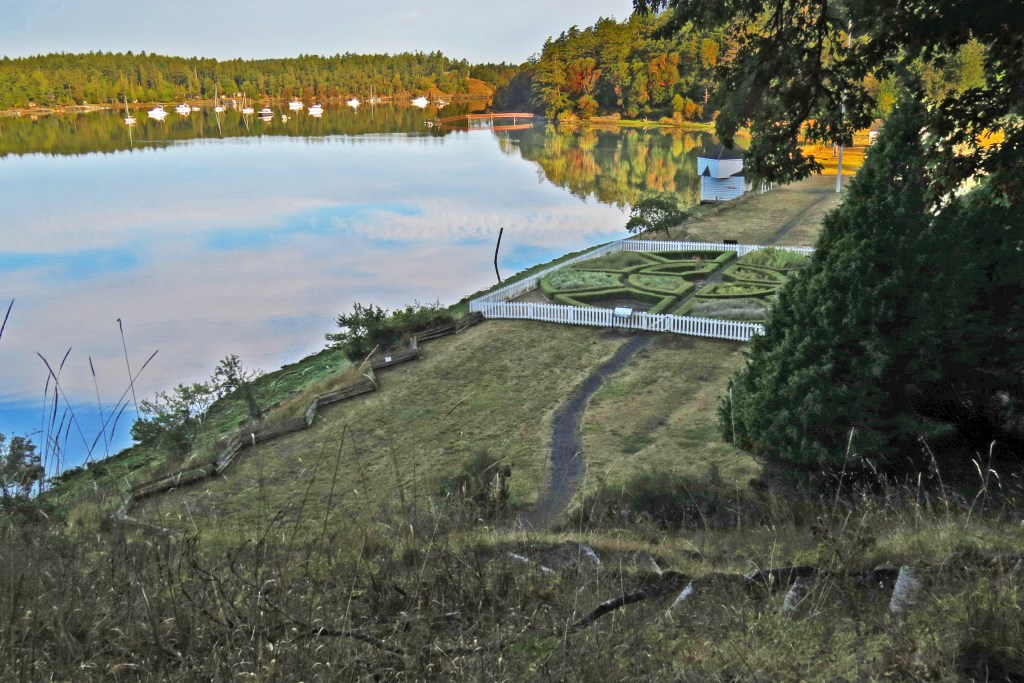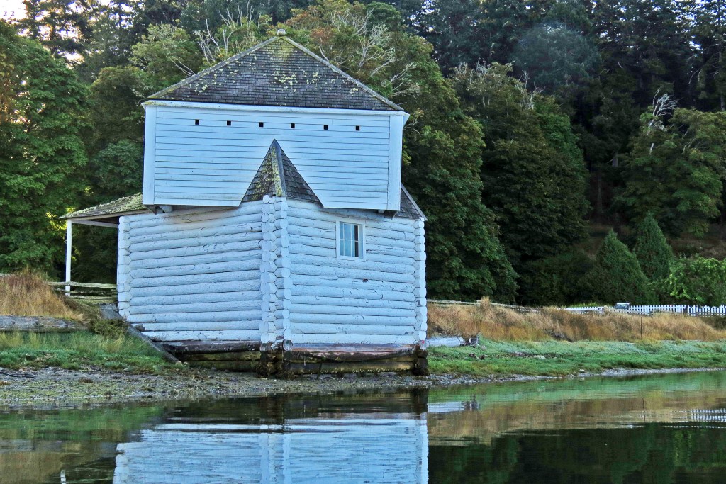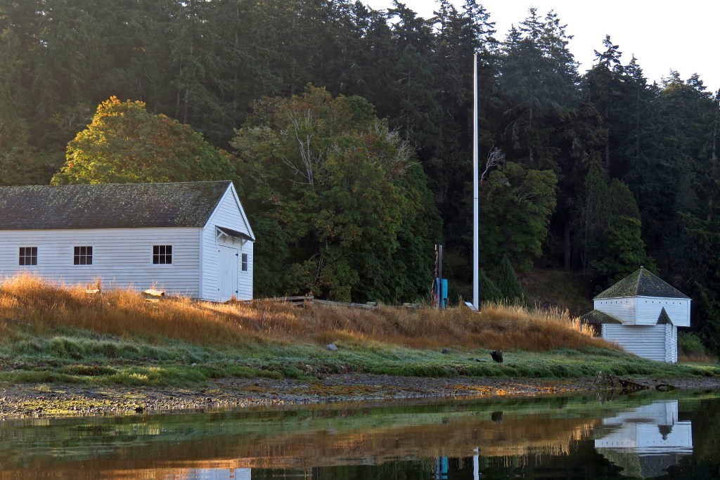 I don’t want to be late for Al’s Sunday morning breakfast, so I’m up and on the water by 0650 hrs, headed for English Camp, in Garrison Bay, where the Royal Marines were garrisoned from 1859 to 1872, during the Pig War, which settled the territorial dispute between the U. S. and Britain over where the U. S./Canada border would be established.  Twelve years later, Germany, the aribitrator in the dispute, determined the border to be at the 49th parallel.   The U. S. won, so now the San Juan Islands, including the English Camp, are located in the U.S.