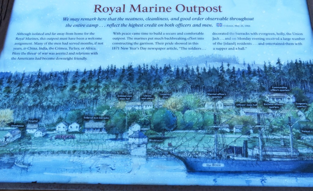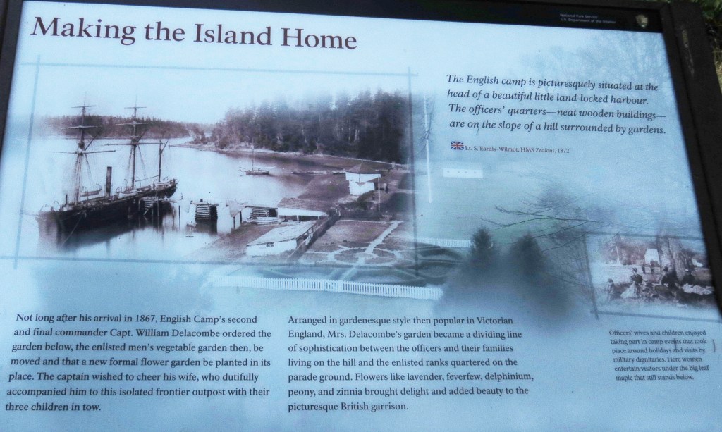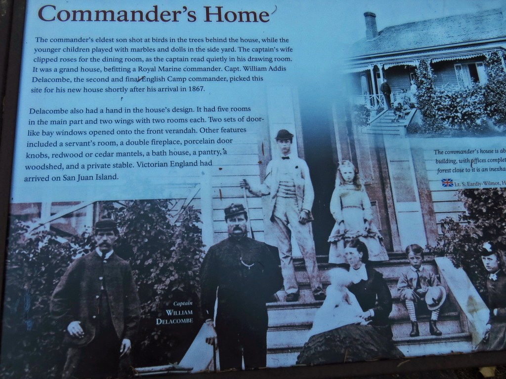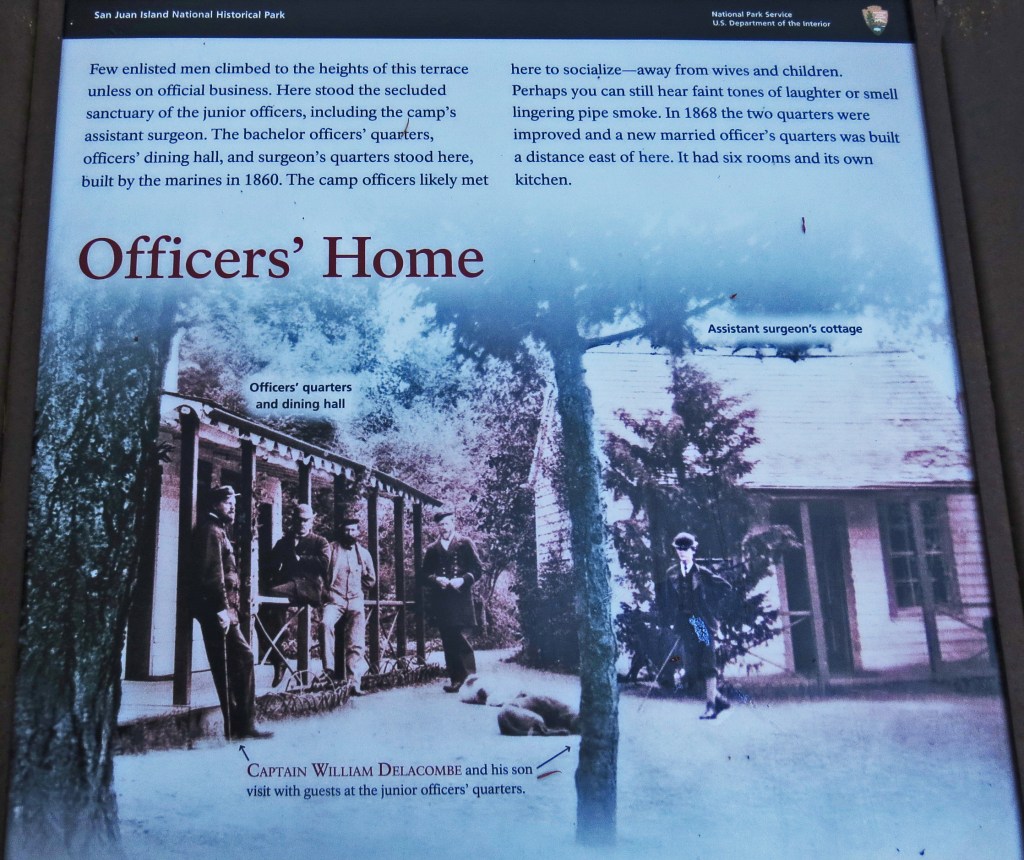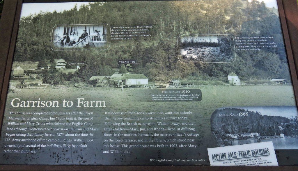 Once the Pig War dispute was settled, the Royal Marines departed.  In 1875, William and Mary Crook laid claim to the property through the Homestead Act provisions.  They started living in the buildings left by the British.  They had lots of buildings to choose from, since there were about 28 buildings in all.  Eventually, however, William and Mary Crook’s son, Jim Crook, built a beautiful home on the property.  That home, unfortunately, like most of the buildings, has not survived.