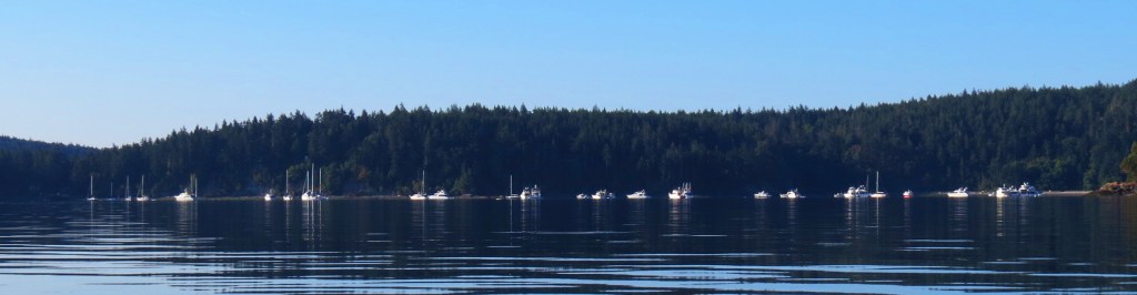 We’ve decided to move on to Blind Bay, on Shaw Island this morning, before we grow to the bottom here.  So, after breakfast, Al fired up the engines and we headed out.  We didn’t have far to go.  After about 90 minutes, we were pulling into Blind Bay.  We could not believe the number of boats in the anchorage.  I counted 60 boats!