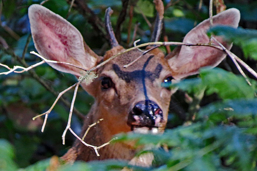 I hadn’t gone 100 feet when I stopped to change the setting on my camera. When I looked up, there was a deer heading into the underbrush, about 50 feet in front of me.  By the time I got my camera adjusted, he was gone.  But, on the other side of the road I saw some movement in the brush.  I zoomed in, hoping to find him, and there he was staring back at me!
