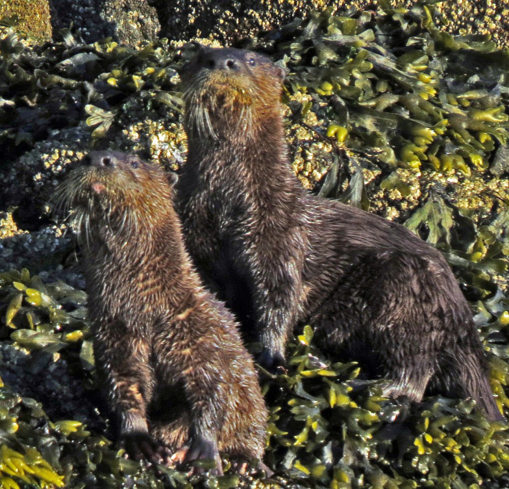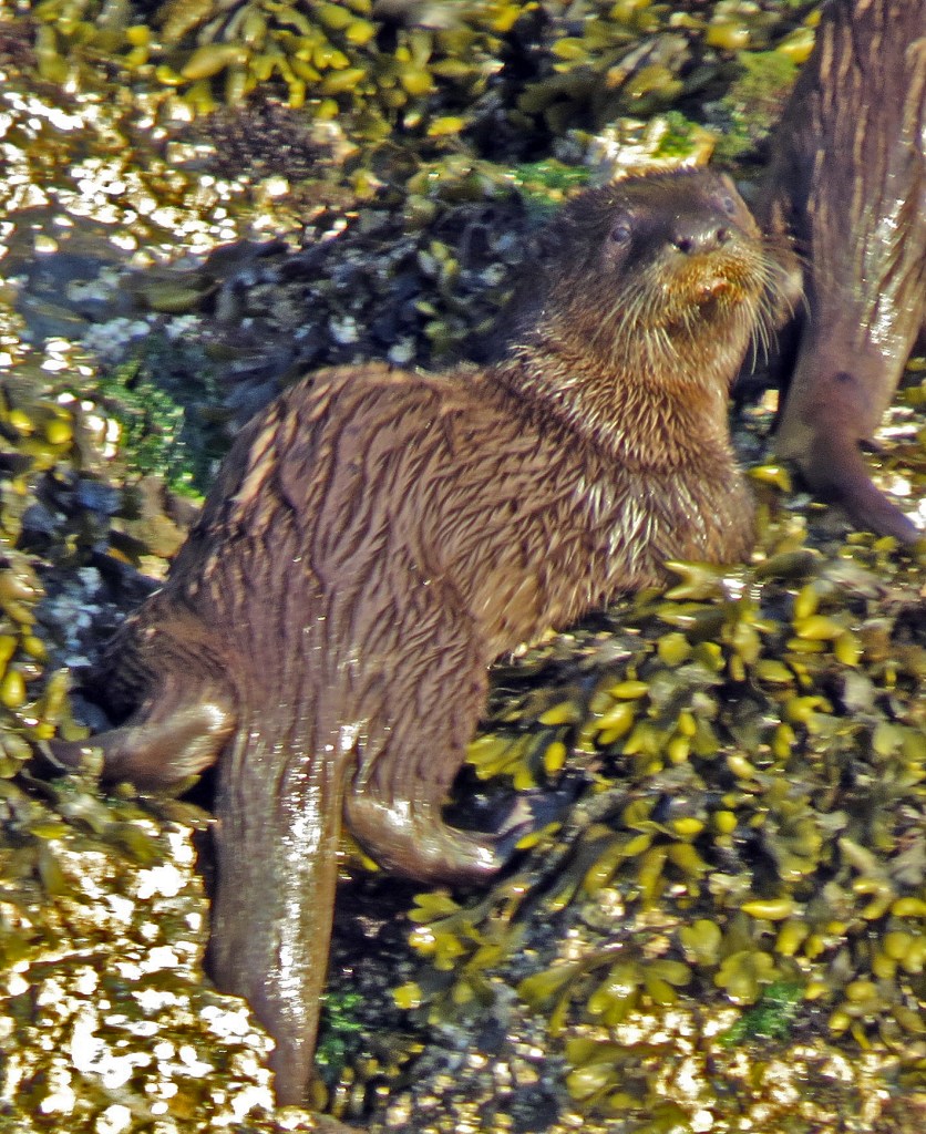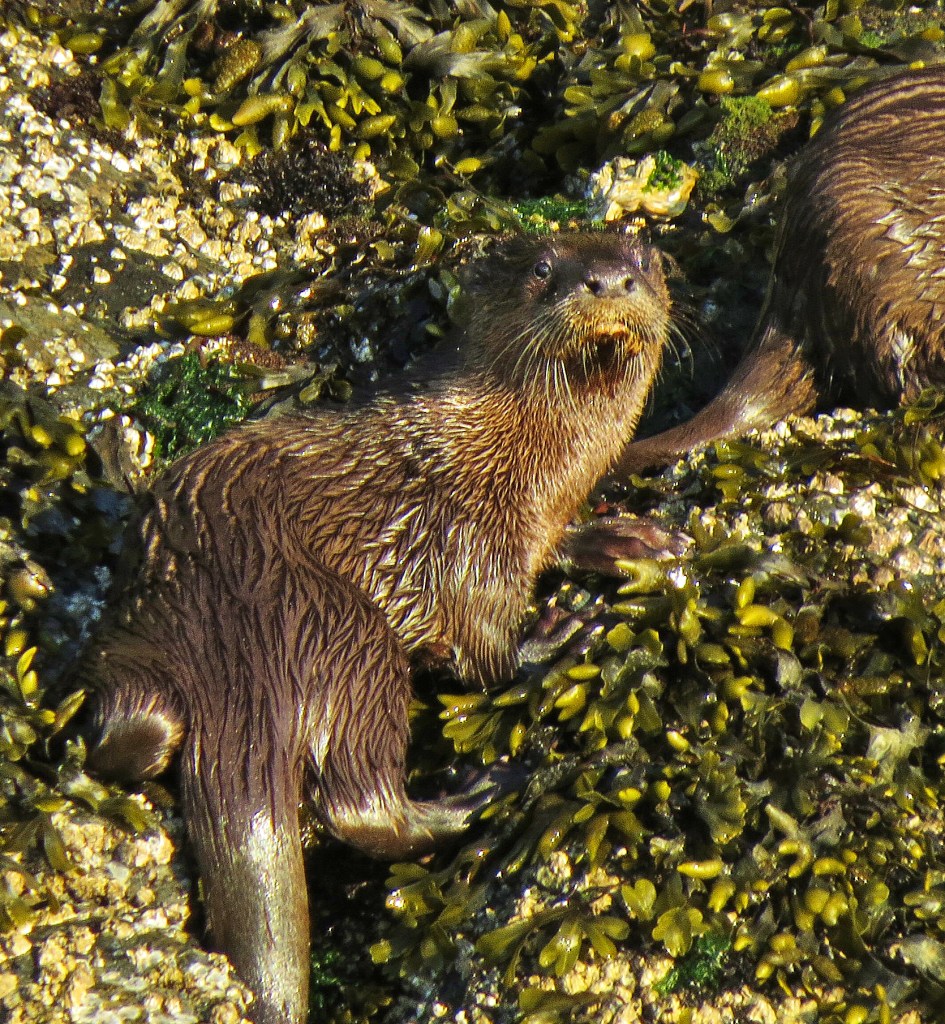 I noticed some disturbed water along the shore and zoomed in with my camera to take a look.  Otters!  There were six of these clowns having a gay old time.  I followed them.  They’d haul out and play on the rocky shore for a while, and then head back to the water, swimming a little farther north.