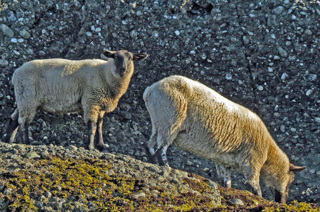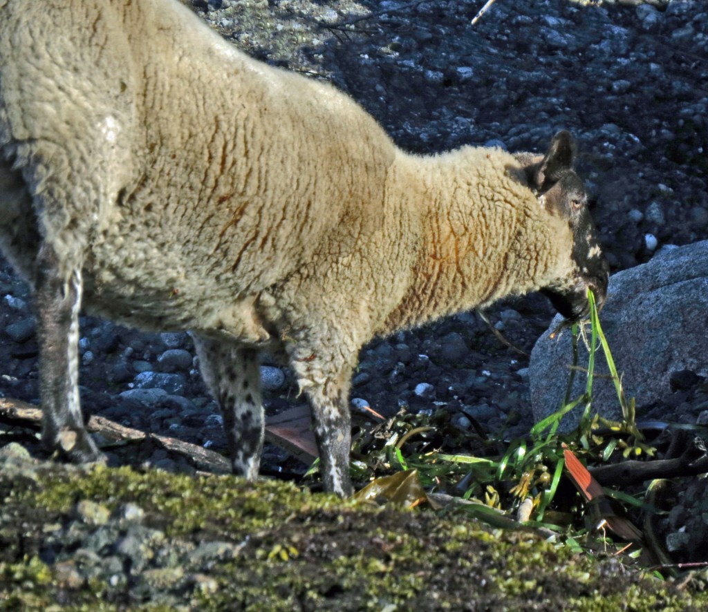 And then, another sheep appeared, and another. There were several sheep grazing on the grass, and the seagrass exposed by the low tide.