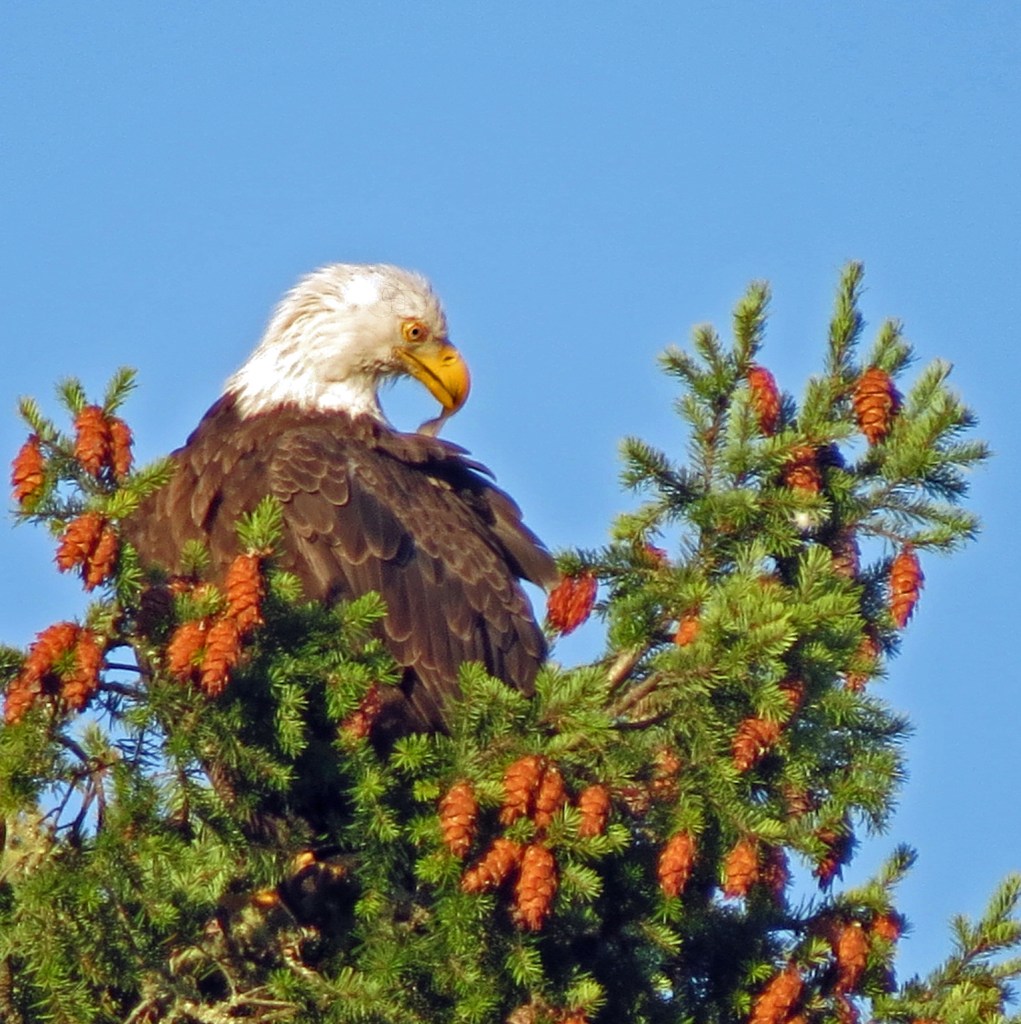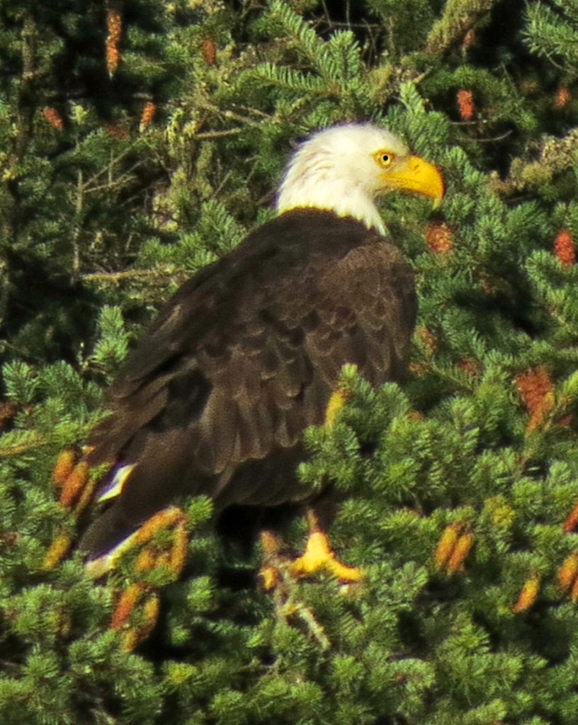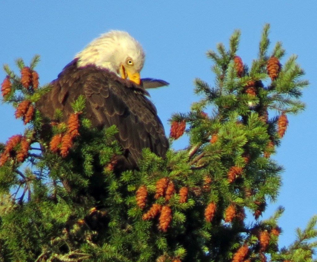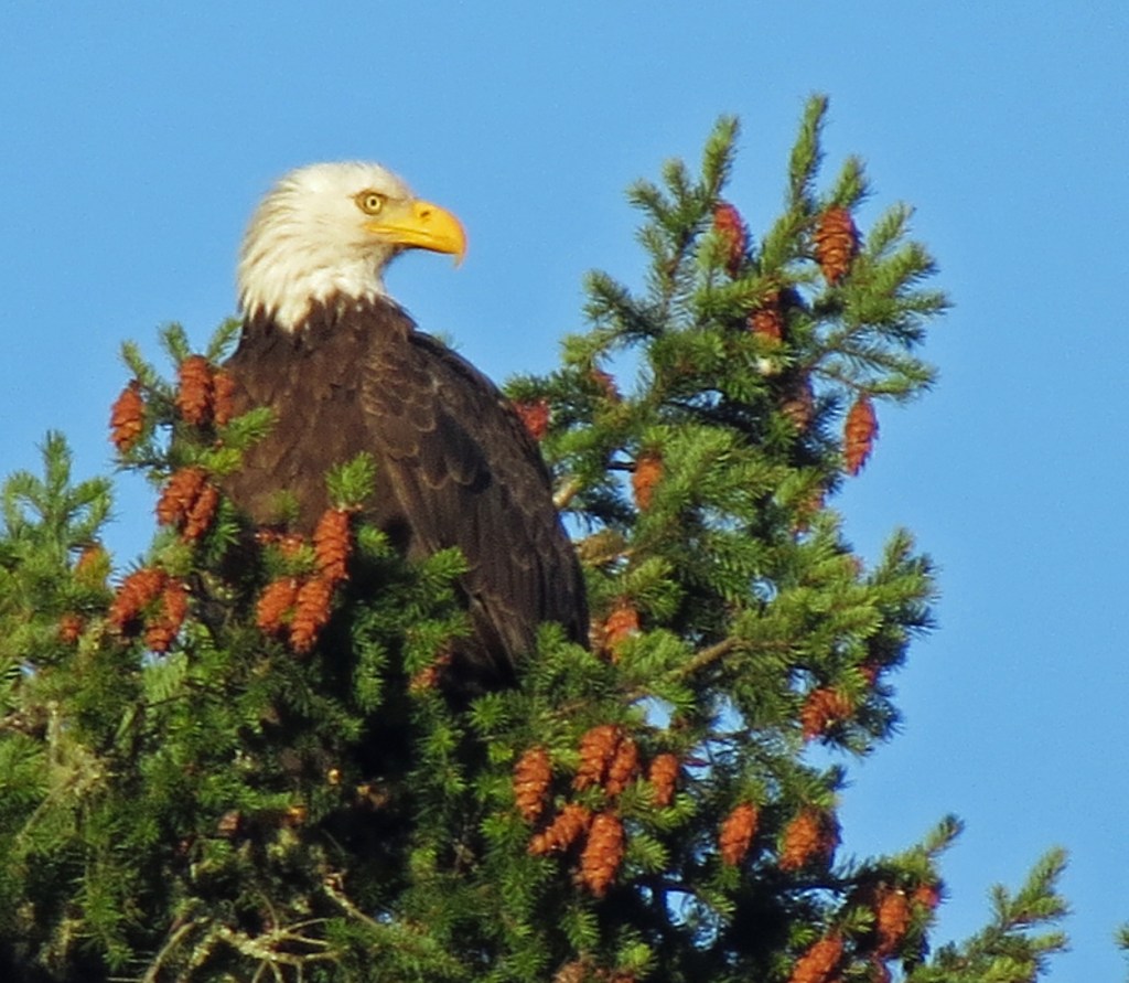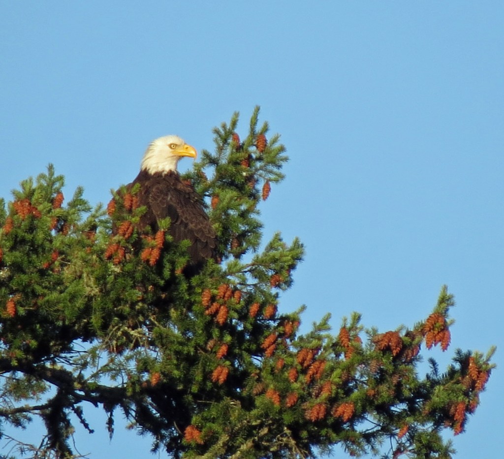 The wind is calm and we have another beautiful sunny day in store for us. We’re leaving right after breakfast for Reid Harbor, on Stuart Island, so I have to get my paddle in early. Fortunately, I didn’t have far to paddle for my first photo op. An eagle landed in the top of a tree right near the boat.