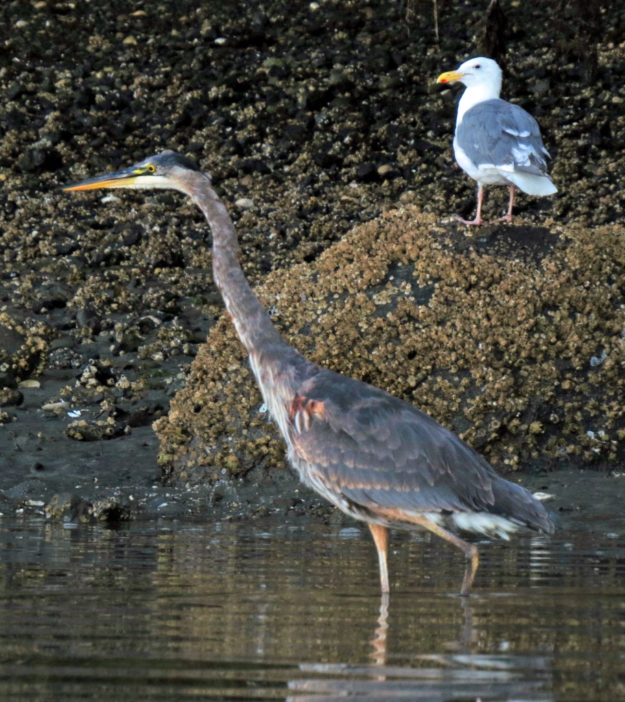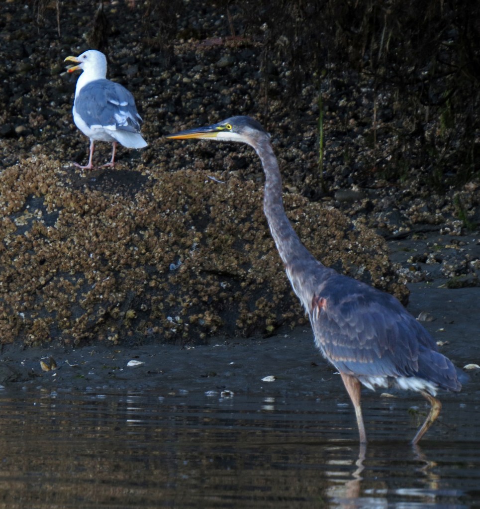 He headed along the shore, coming my way. A seagull was looking for low tide goodies also, and didn’t appreciate this guy horning in on his territory.